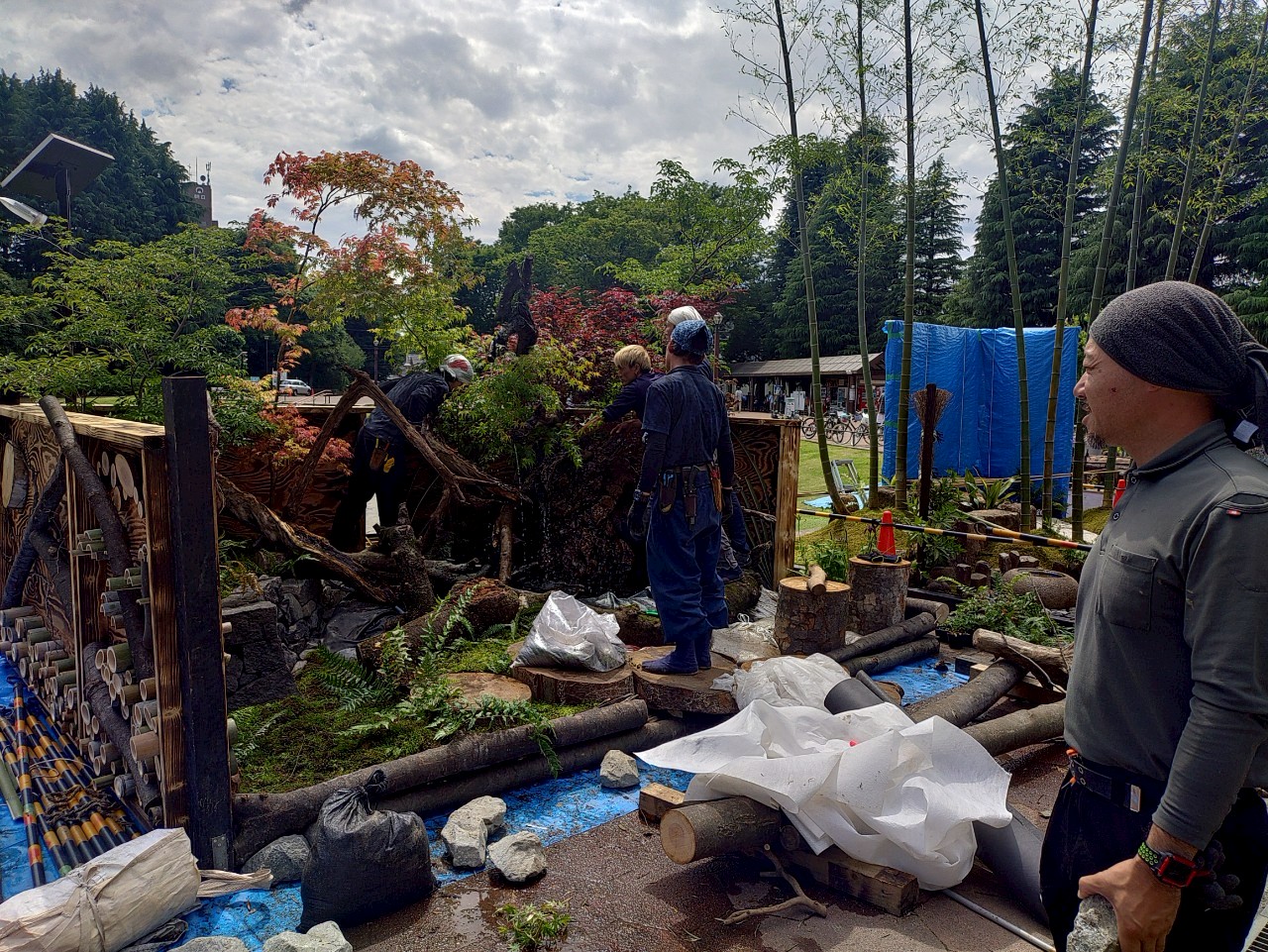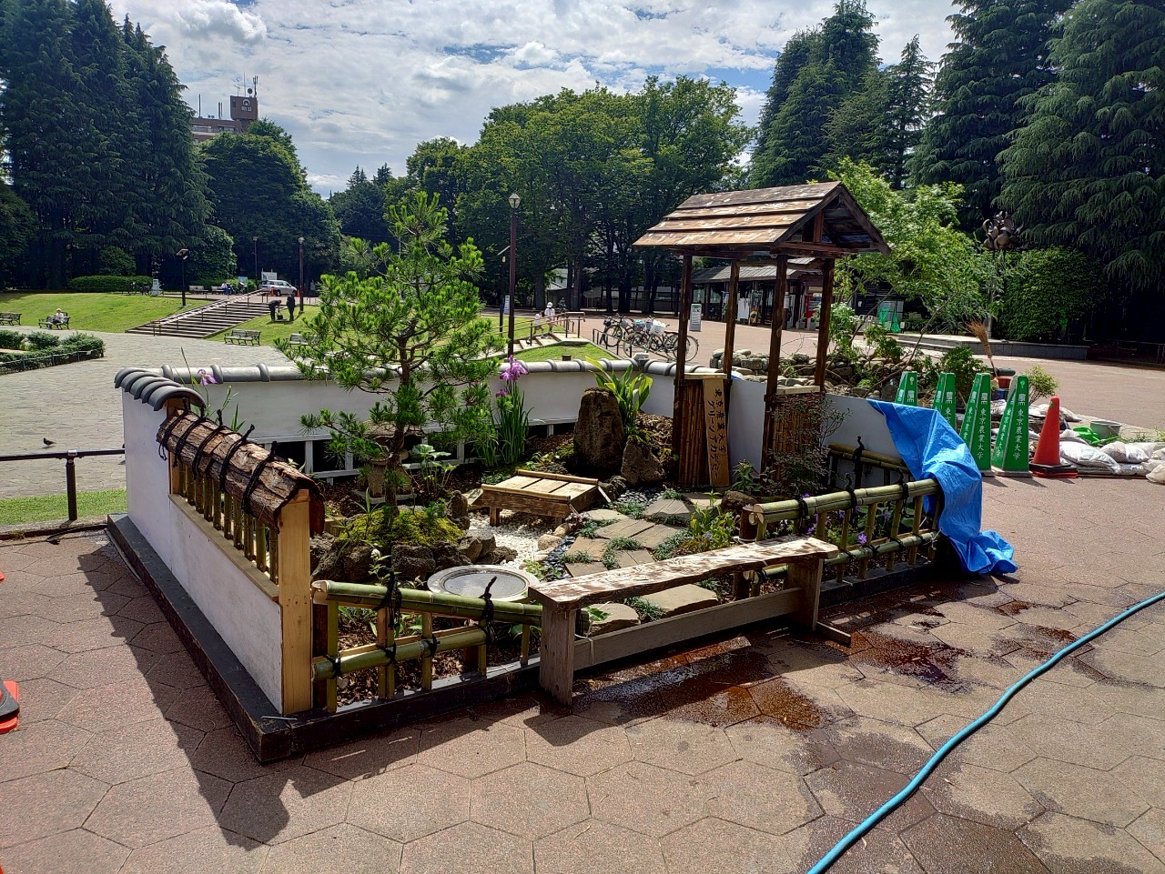 日本造園組合連合会東京都支部の4組合(玉川造園組合、世田谷植木職組合、東京庭職組合、東京緑化倶楽部)の作庭も佳境になってきました。みんな和気あいあいで水の出方の確認をしていました。