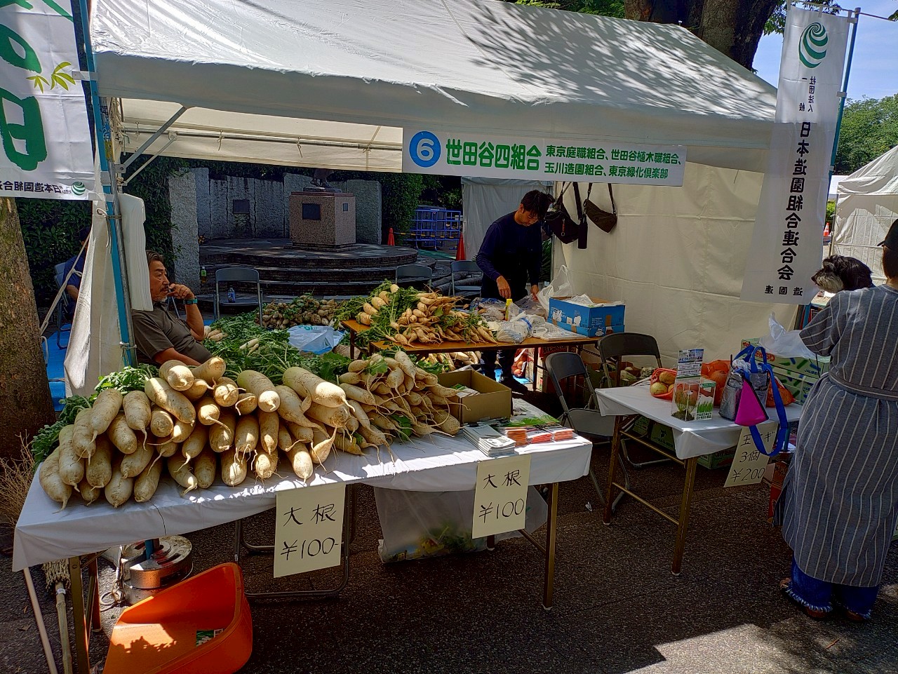 世田谷四組合(玉川造園組合、世田谷植木職組合、東京庭職組合、東京緑化倶楽部)の大根の販売。今回は販売まえから行列が出来ていました。野菜高いですからね。