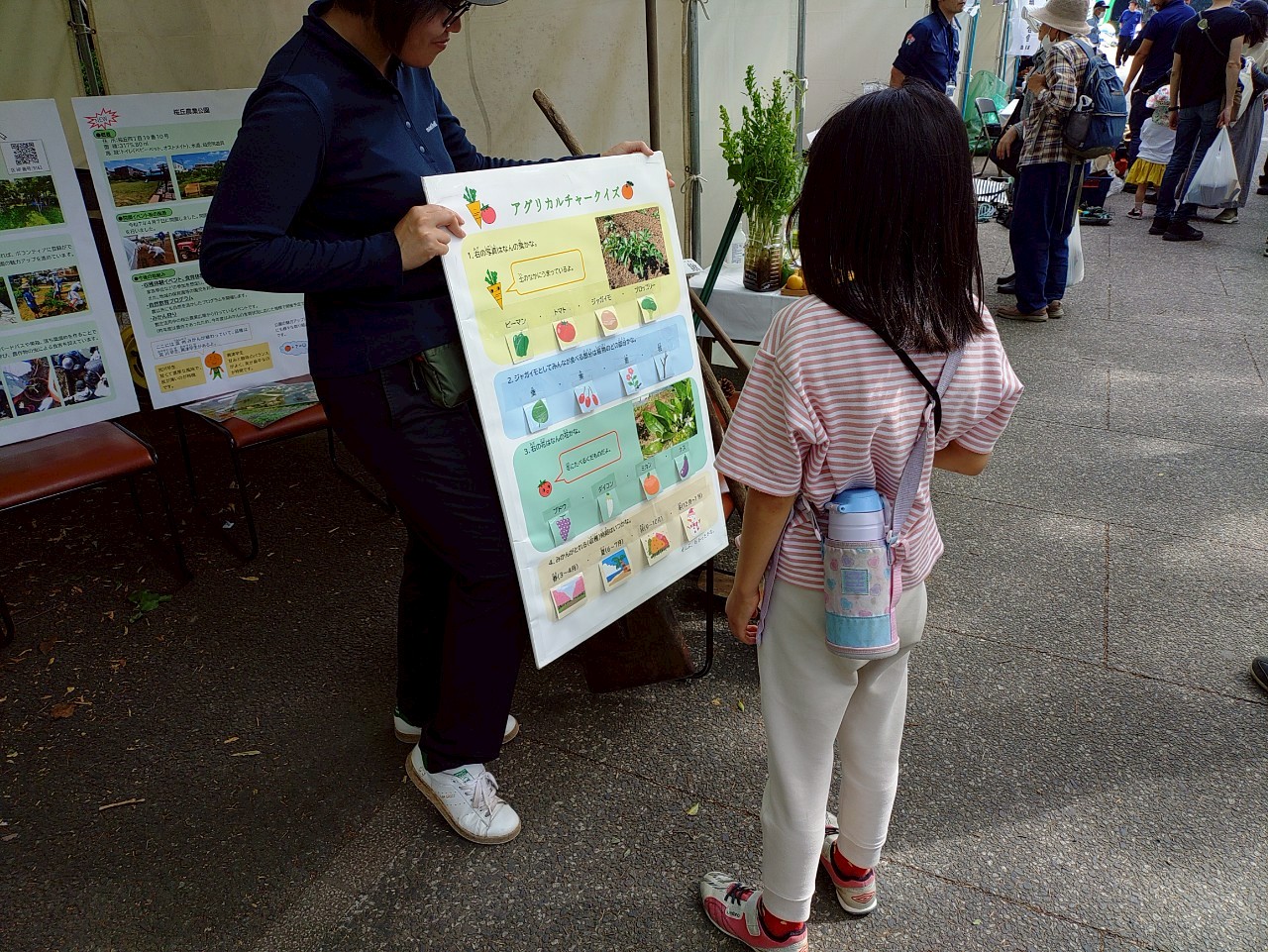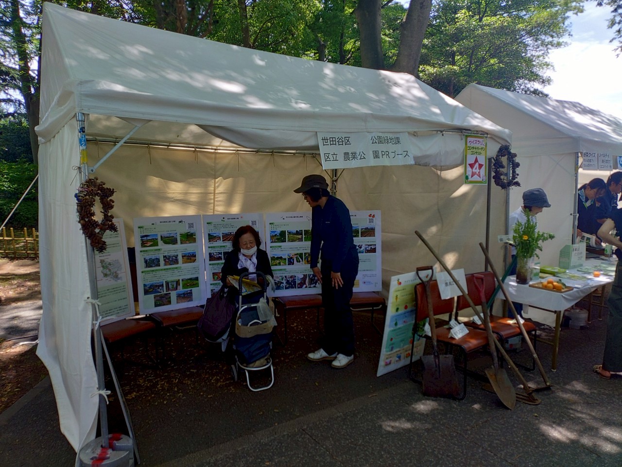 世田谷区公園緑地課のブース。農業公園の紹介です。農業公園とは世田谷の農の文化や風景、環境を継承するために整備された公園です。そこでは農に「触れ」「学び」「楽しむ」ことができます。農業公園は現在4つあります。詳細は以下のリンクでご覧ください。