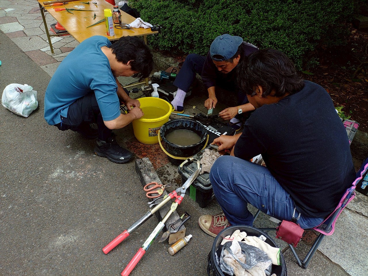 ハサミ研ぎもやってもらえます。他にはシュロの葉で作るバッタの体験、スウェーデントーチの販売、古道具販売も行っています。