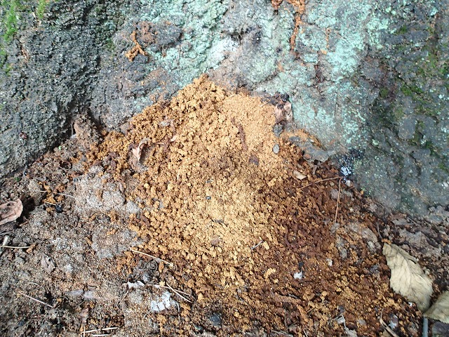 まず、4月から夏にかけて根元にモリモリの木くず(フラス)が溜まります。フラスの形状はひき肉のような形です。これだけ木くず出ているという事はそれだけ幹が食い荒らされているという事だと思います。なので被害にあった樹木は衰弱して枯れてしまいます。