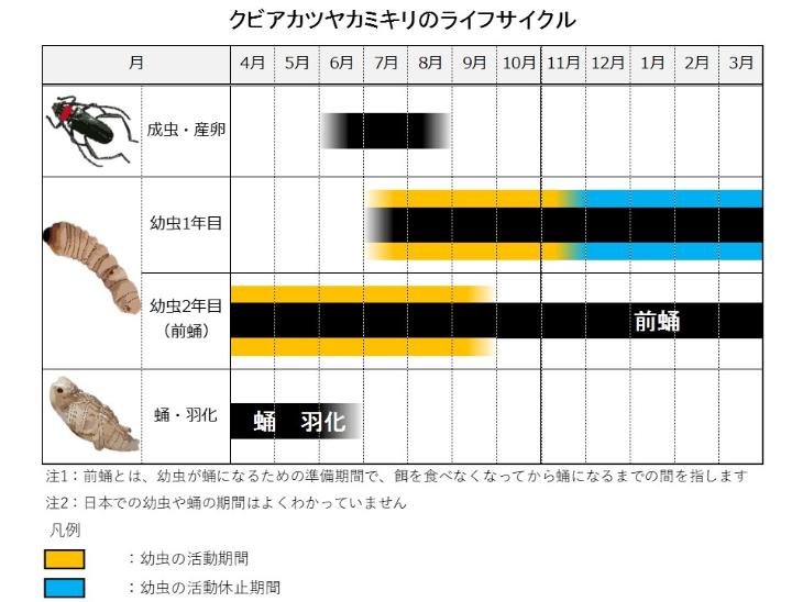 生活サイクルです。およそ2年で成虫になるようです。ただし1年で出てくる場合もあるそうで、正確にはわかっていないのだとか。今後の調査が求められています。大量の木くずや成虫を見つけた場所の市区町村の環境課に通報してほしいです。