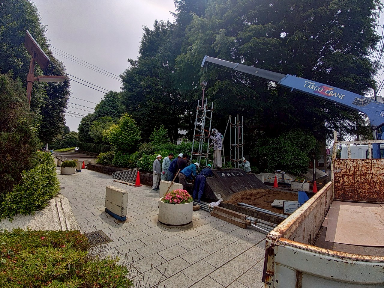 日本造園組合連合会東京都支部の4組合(玉川造園組合、世田谷植木職組合、東京庭職組合、東京緑化倶楽部)の作庭も佳境になってきました。みんな和気あいあいで水の出方の確認をしていました。